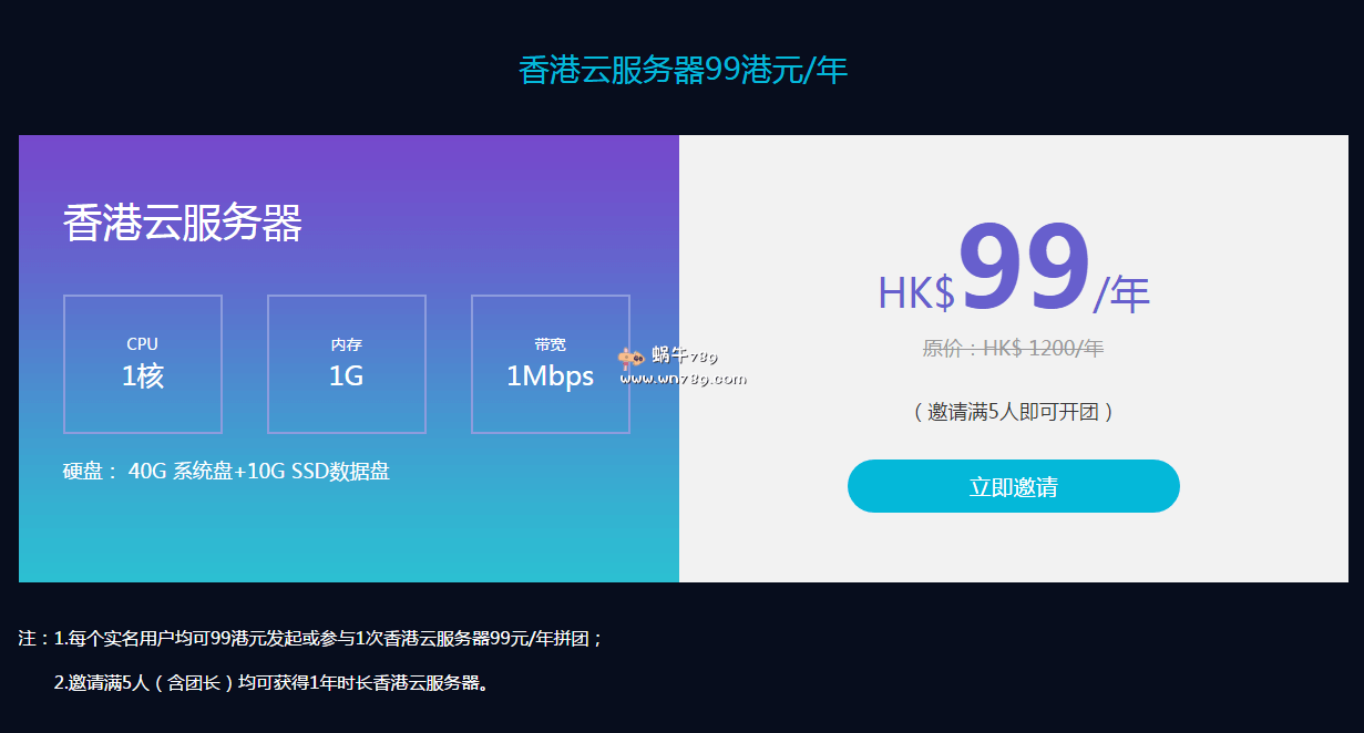 以下拼团活动主打的是香港云服务器,1核1G内存、1Mbps带宽、50GB硬盘只需99港币/年。发起活动或购买必须先支付99港币,而且开团必须满五个人才算拼团成功,其实五个人也不难,但蜗牛不想撸了,想撸的可以留言自己的拼团地址,蜗牛免费发布。 至于“99港元拼团”活动主打的是香港1核1G内存VPS,价格确实比较诱人,但是拼团还是有一定风险的,因为必须先支付99港元,如果没有达到5人拼团购买就算拼团失败,并且支付的99港元不退还,如果确实对“99港元拼团”活动感兴趣的朋友可以试试,没有平台发自己的拼团链接的话可以联系蜗牛,蜗牛帮忙在此文章发布。