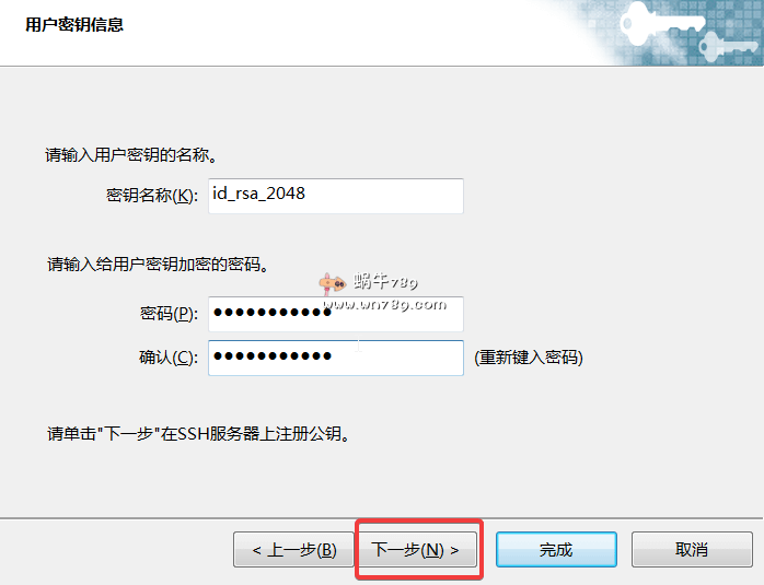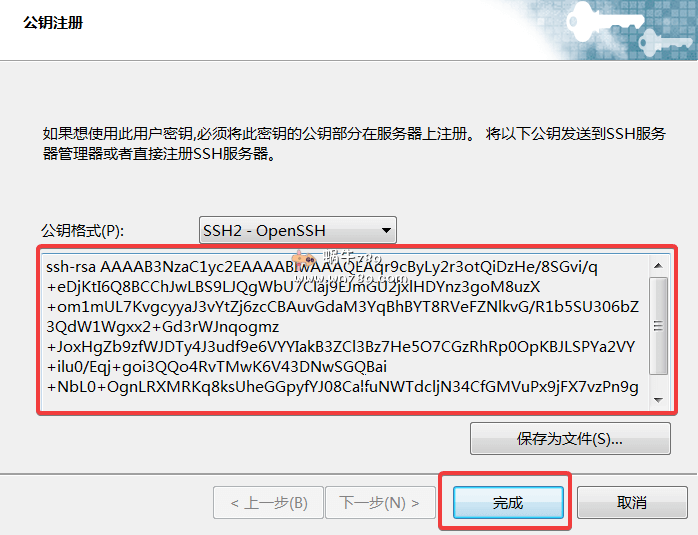 这一步蜗牛还是说句话吧,一个是红框内容是公钥,复制填写到购买是的公钥填写栏,然后自己一定要保持公钥文件后,不然后面登陆不了SSH了。