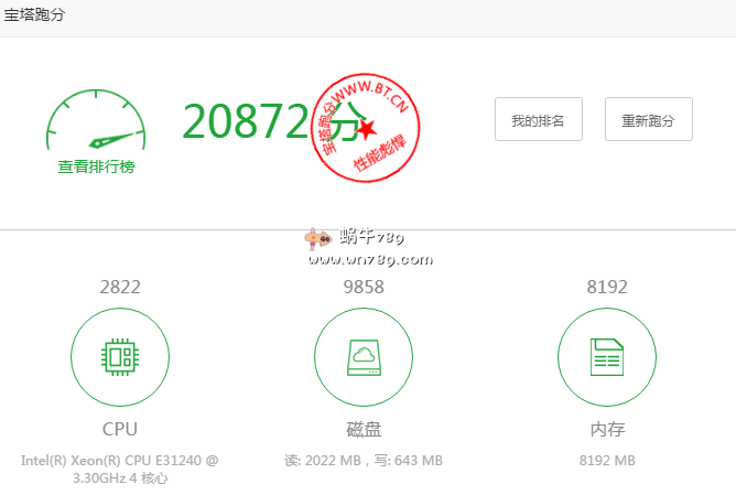 1、宝塔跑分。得分比较高,但是不排除是OpenVZ架构的原因。但是硬盘读写是非常不错的。另外OpenVZ只要不是超售非常严重,性能应该还是不错的,因为CPU、内存都是使用了才占用,没有使用是不占用母机内存的。就目前来看,商家销售量应该不是很大,对性能造成的影响也比较小。