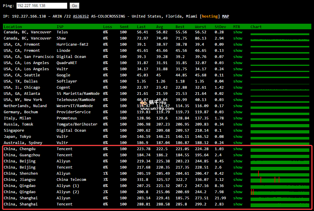 7、服务器到国内电信、联通、移动回程Ping测试结果。