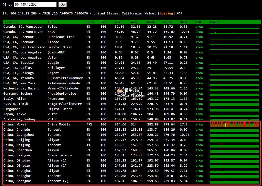 3、丢包及抖动测试。国内节点整体稳定性还可以用。从测试结果来看甘肃武威移动丢包较为严重。