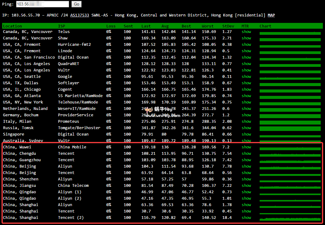 2、丢包及抖动测试。全球节点都非常稳定。到北美速度也非常不错,适合国内客户、兼顾北美的业务使用。