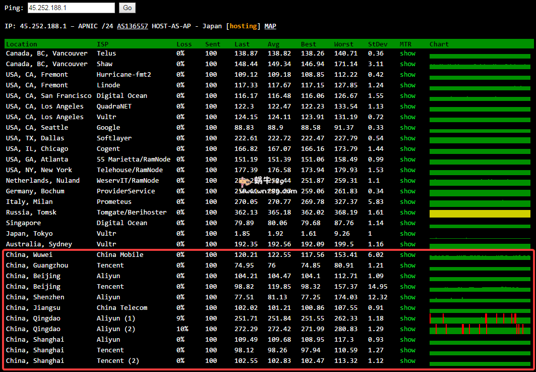 3、抖动及丢包测试。国内总体速度还算可以,部分节点有丢包现象。