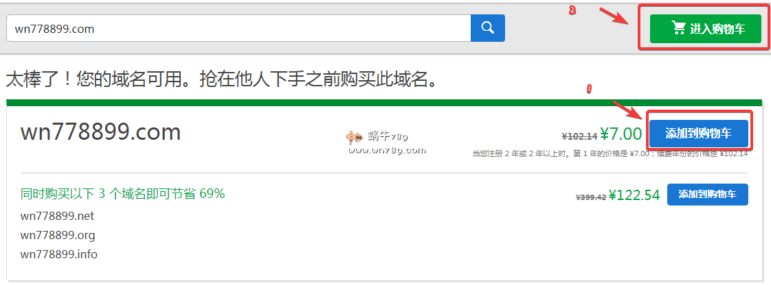 1、点击上面地址进入域名注册页面后,输入自己想注册的域名,然后点搜索进入到如下图页面。我们首先把可以注册的域名添加到购物车,然后点击“进入购物车”。
