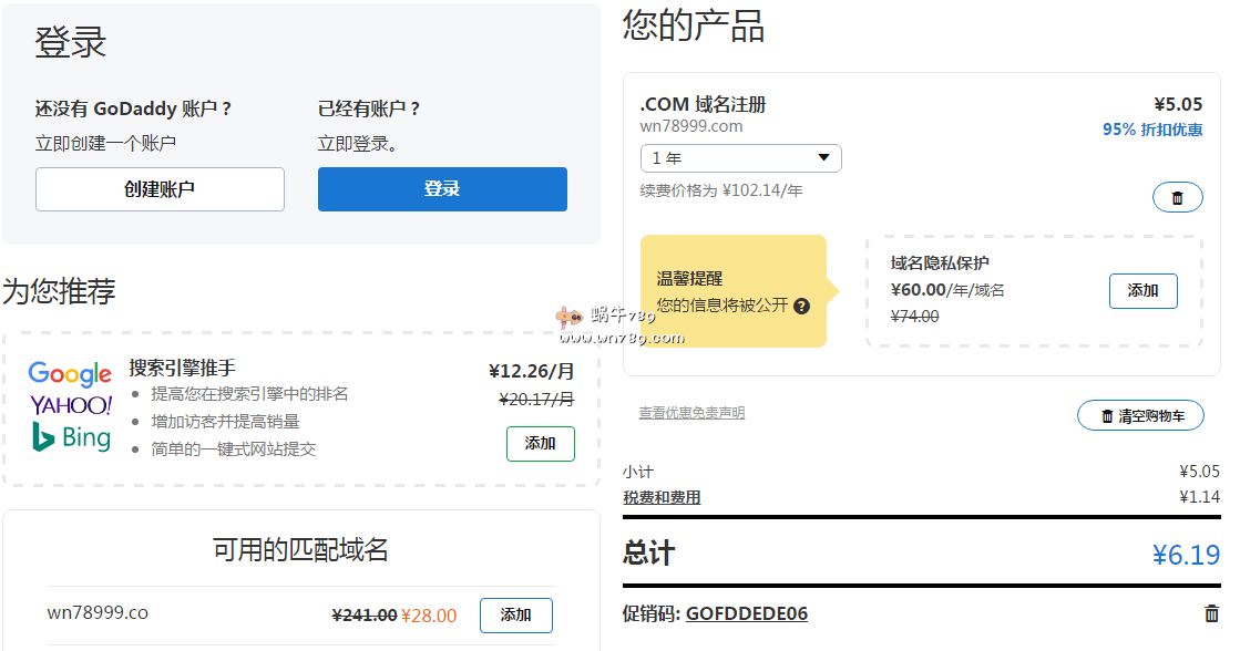最近GoDaddy放出了一个给力活动,新注册.com域名首年只需5.05元,加速税费等费用也只需6.19元,并且支持支付宝付款购买,这个确实可以值得一撸。虽然GoDaddy域名续费相对比较昂贵,但是我们注册后60天可以转入到国内商家,如阿里云、腾讯云;也可以转入到其他续费比较便宜的国外商家,如Namesilo。好的,废话少说,直接上活动吧。