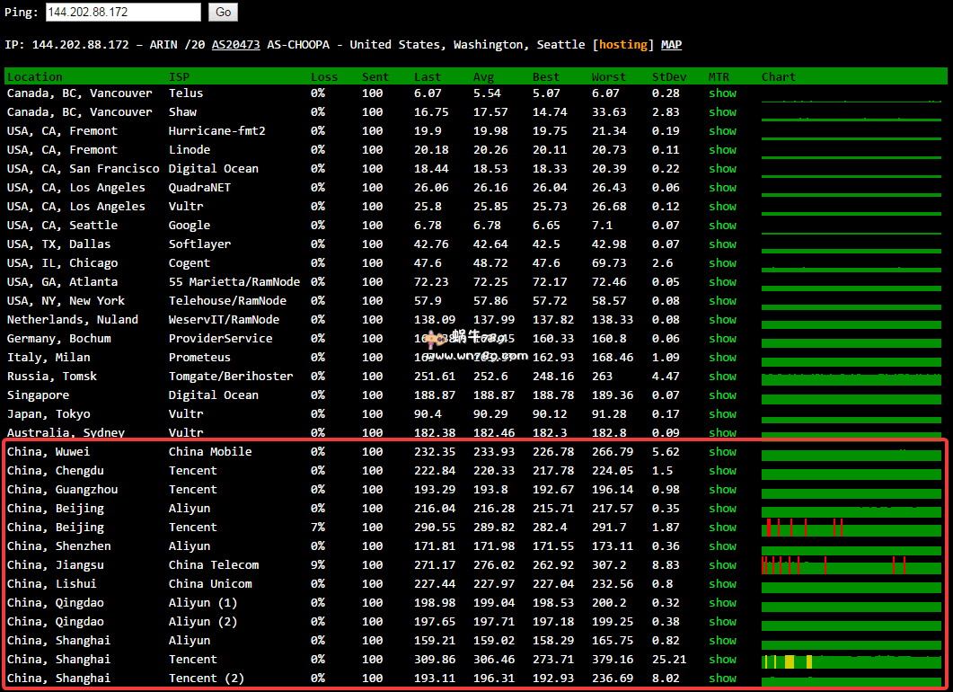 1、中国电信、联通、移动、铁通ping测试结果。以下是晚上10点后测试,蜗牛记得在晚上7:00-9:00测试结果差不多,高峰期表现也还不错,四大网络都还算稳定。