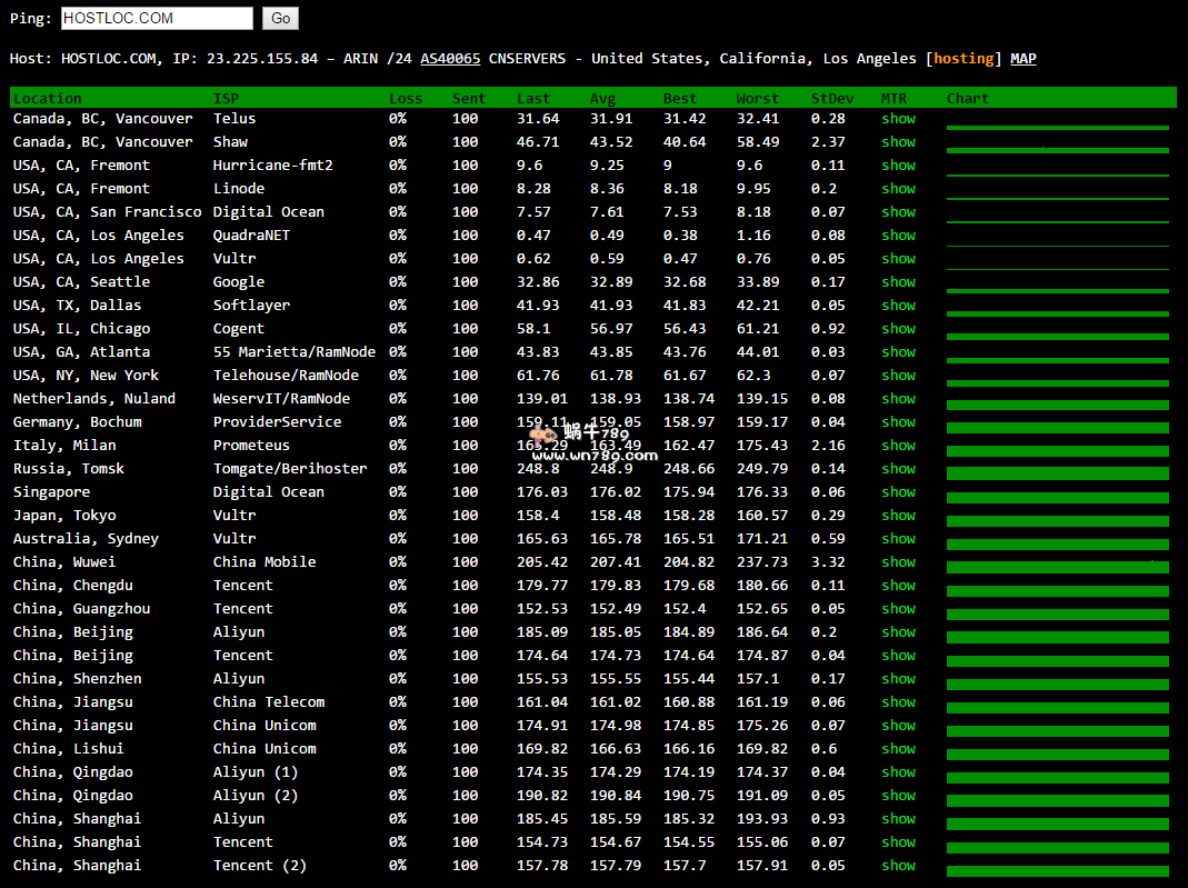 1、中国电信、联通、移动、铁通四大网络ping测试结果。电信、联通、移动三网非常稳定,ping延迟在170毫秒左右,访问速度优秀。