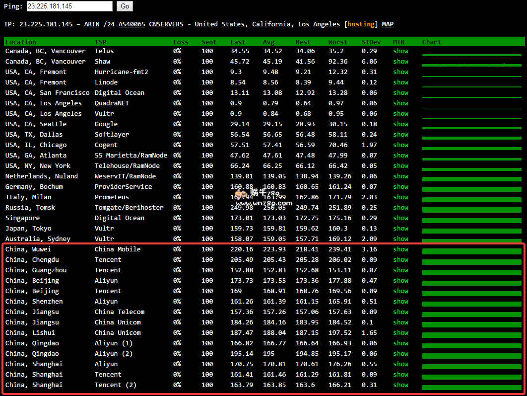 1、中国电信、联通、移动、铁通四网ping测试结果。四网平均ping在175毫秒,优势不只是延长低,而是最快节点和最慢节点的速度相差甚少,整体速度都还不错,建站使用推荐。