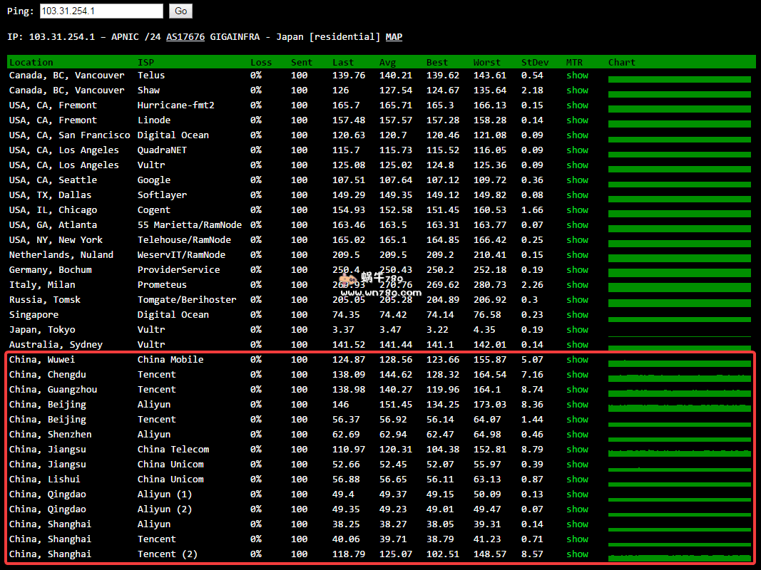 1、中国电信、联通、移动、铁通四网ping测试结果。四网平均延迟在110毫秒左右,到中国大陆速度非常不错。
