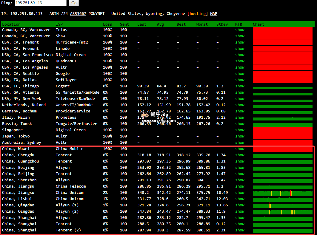 2、全球抖动及丢包测试。部分节点无法连通,不知道是IP没有生效的原因还是其他原因。到国内速度比较稳定,部分节点有丢包现象,从Voxility高防IP来说算不错的了。