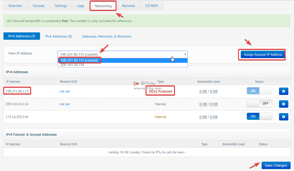 如何启用中国优化高防IP?首先我们登录VPS控制面板,如何登录控制面板?相关信息在邮件里可以找到,这里就不啰嗦了,直接说如何启用高防优化IP。按下图操作,如果启用后带宽不可以使用,那么就重启下系统或重装下系统,一般不会有任何问题。