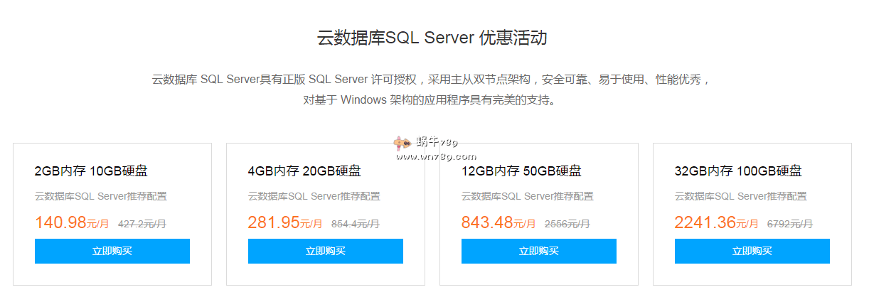 腾讯云云数据库SQL Server 优惠活动促销方案一共有四个,最低2G内存、10G硬盘,最高32高内存、100G硬盘,应该来说可以满足绝大部分的需求。
