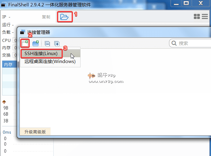 2、如何通过SSH连接自己的服务器。首先打开FinalShell,然后点击如下图1位置打开“连接管理器”,根据自己需要选手SSH连接或远程桌面连接。蜗牛这里主要讲SSH连接,那么我就点击“SSH连接”。