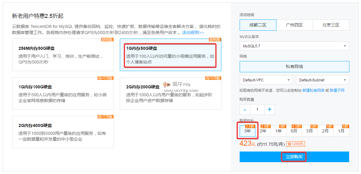 腾讯云云数据库MySQL外网启用及外网连接数据库安装WordPress教程),但是建议大家配合腾讯云云服务器使用,通过内网访问效果更佳。所以大家在购买时云数据库时要与云服务器在同一区域、同一网络当中,这样才能实现内网访问。此次腾讯云云数据库促销活动涉及数据中心有成都二区、广州四区、北京三区,所以购买云服务器时也只能选择这三个区域,MySQL版本为5.7。