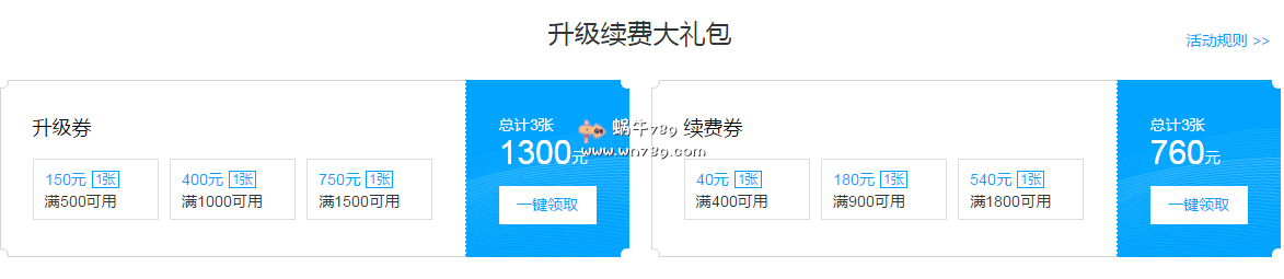 2、另外还有升级续费大礼包可以领取。新、老用户均可领取升级券3张、续费券3张,仅可用于数据库产品MySQL、Redis、MongoDB、SQL Server及PostgreSQL的续费/升级,每个续费/升级订单限用一张代金券,使用门槛见代金券,续费/升级代金券不可在活动页面使用;代金券有效期自领用当天开始30天有效期。