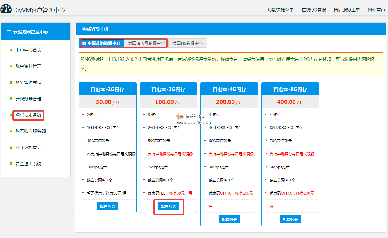 香港沙田机房还有一个2核1G内存方案没有列举,由于2核1G内存方案需要50元/月,个人绝对性价比没有3核2G内存方案折后性价比高,所以没有列举,有需要的可以到官网自行选择。