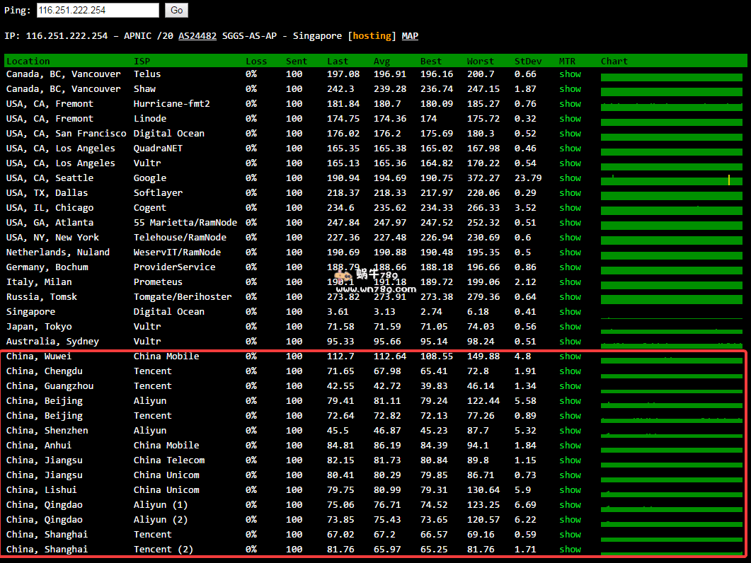 7、国内ping测试结果,全球各个区域ping平均值在100毫秒以内,非常给力了。