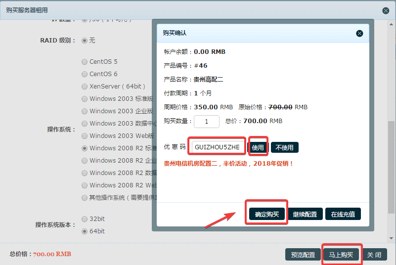 如何使用优惠码?选择好自己要购买的方案点击“立即购买”,然后选择好购买期限、系统等选项,然后点击“马上购买”,紧接着在“购买确认”窗口就能输入对应优惠码了。输入优惠码后可以点击“确定购买”就能完成购买了,不过前提是你账户里有足够购买对应配置的余额。另外如果账户里有余额,不要随意点确认购买,因为一点确认购买就完成购买了。