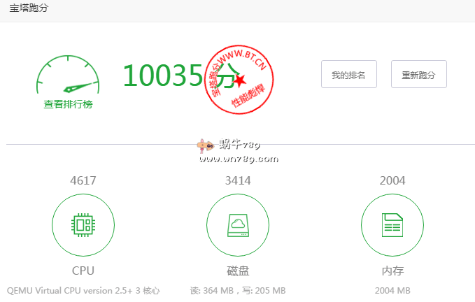 9、宝塔跑分测试。蜗牛开通的事3核2G内存配置,CPU计算能力得分不错,建站使用毫无压力。