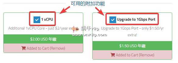 购买时可以花2美元/年增加1核CPU、1.5美元/年升级到1Gbps带宽端口。