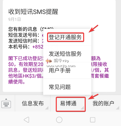3、如果要新开通香港号码请在微信公众号按下图提示进入开通页面,然后选择香港电话按流程操作即可。开通香港号码比较简单只需输入一个中国大陆号码就行,至于支付方面也比较简单,支持支付宝、微信、银行卡等方式,建议直接选择微信。另外关于易博通eSender的常见问题,大家可以仔细看看,里面可能又你需要了解的东西。