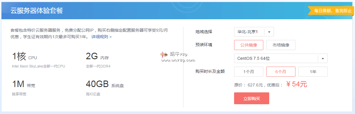华为云是国内知名云计算服务商家,隶属于华为软件技术有限公司旗下产品。此次华为云面向通过个人认证的全日制在校大学生(包括普通专本科、硕士、博士)提供学生优惠方案:1核CPU(Intel Xeon SkyLake全新一代CPU)、2GB DDR4内存、40GB高IO云盘、1Mbps带宽独享、不限流量、1个IPv4,月付9元、半年付54元、年付只需99元;所有完成实名认证的全日制在校大学生(普通专本科、硕士、博士)在学生认证有效期内可享受此优惠价格,实名认证和学生身份验证必须要一致。