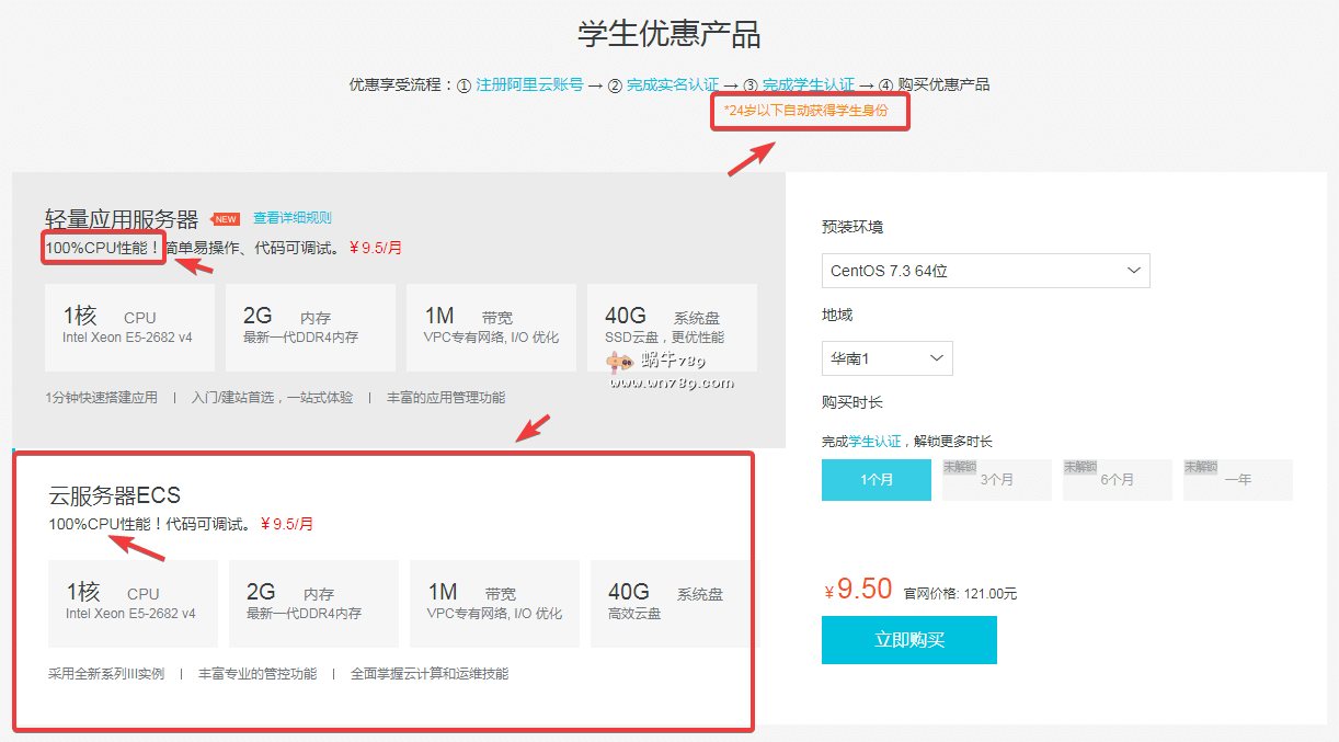 在学生身份有效期内,购买的学生机可按学生优惠价格续费,每次续费时长在1-12个月内自行选择。目前阿里云学生机配置是:1核2G内存、40G高效云盘、1Mbps带宽,此配置搭建一个个人博客是毫无压力的;目前学生机可选云服务器ECS或轻量云服务器,并且CPU性能不限。另外蜗牛的账号实名认证超高了24岁,但是亲测也可以以9.5元的价格购买一个月,不过续费就是原价了。