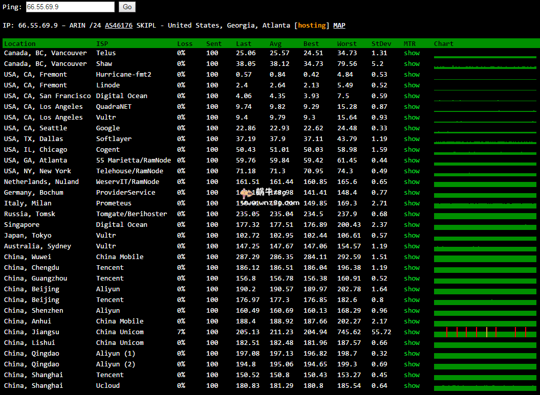 1、全球ping测试结果。从ping测试结果来看到中国电信、联通线路速度不错,移动延迟稍微高点。
