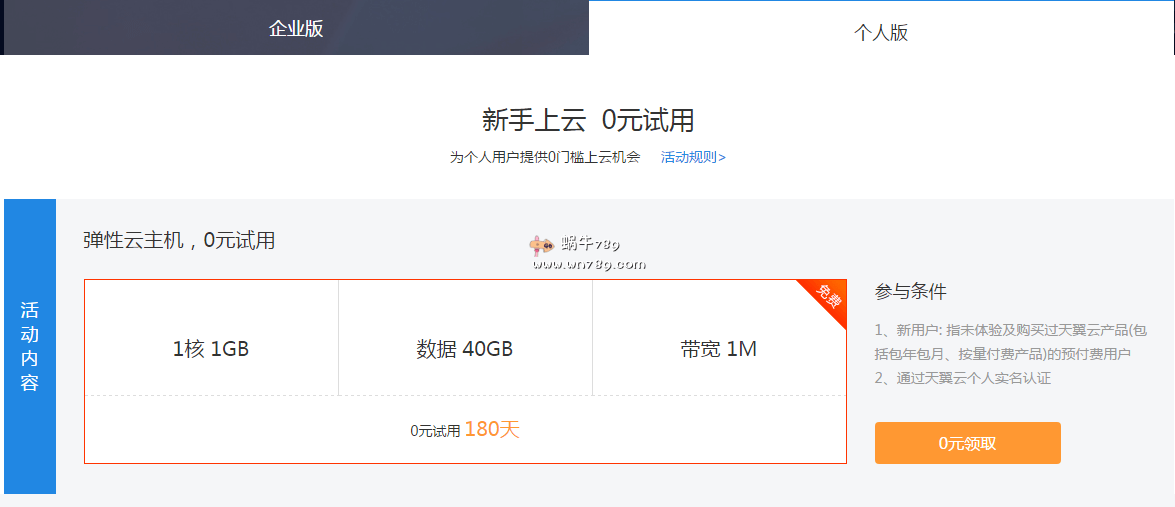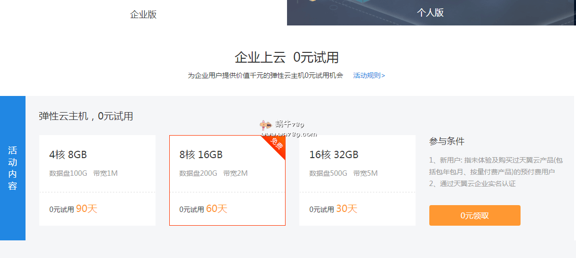天翼云是中国电信股份有限旗下的云计算分公司,目前推出了“新手上云 0元试用”活动,个人/企业用户可以提供0门槛上云机会。企业用户有以下三个方案可以选择:4核8GB内存、数据盘100G、带宽1M(0元试用90天),8核16GB内存、数据盘200G、带宽2M(0元试用60天),16核32GB内存、数据盘500G、带宽5M(0元试用30天。个人用户1核1GB内存、数据盘40GB、带宽1M(0元试用180天)。参与活动的要求是必须是天翼云新用户(从未体验及购买过天翼云产品的用户),而且完成实名认证,实名认证需要通过天翼云手机APP完成,需要上传身份证正反面和完成人脸识别。有兴趣的可以试一试。