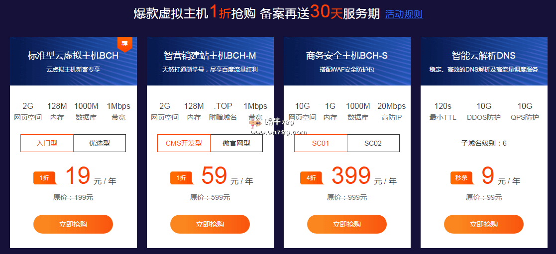喜欢使用虚拟主机建站的朋友,百度云此次促销活动可以说是超值,20Mbps带宽的高防IP虚拟主机也只需399元/年,标准型虚拟主机仅需19元/年起,并且稳定送30天使用时间。