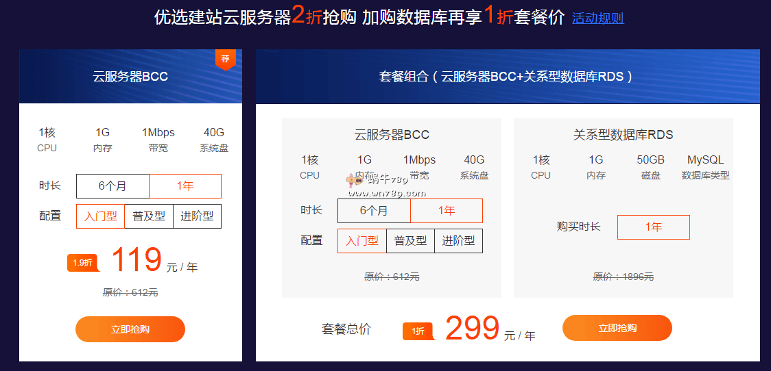 入门型1核1G内存云服务器最低只需119元/年,普及型1核2G内存199元/年,进阶型2核2G内存319元/年,价格降至冰点。另外还有套餐组合可以选择,云服务器BCC+关系型数据库RD(MySQL),1核1G内存299元/年,1核2G内存499元/年,2核2G内存619元/年.