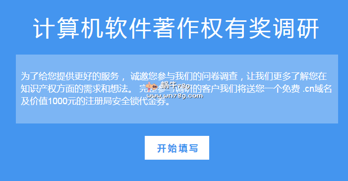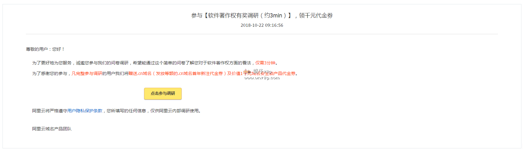 此次活动参与比较简单,只需访问地址提交一个关于“计算机软件著作权有奖调研”的问卷即可,问卷一共才10个题目(最多11个),详细每位博友20秒不到的时间就能完成。想撸免费.cn域名的朋友可以试试,反正.cn续费也不是很贵,而且是我们国家的国内域名,使用率是非常高的,所有真的值得一撸。至于阿里云会不会按时兑现发放奖品的问题,相信不用过多的担心吧,绝对会兑现发放的;如果实在是跑了,话说回来我们也没亏什么。