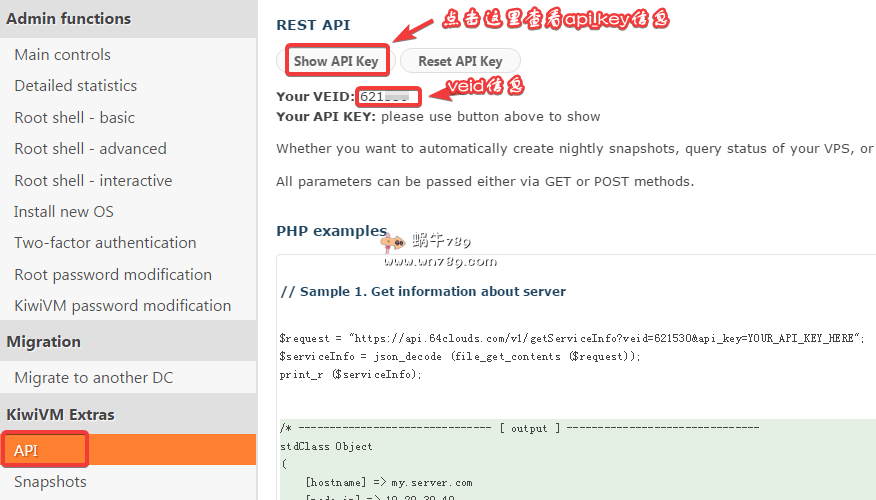 1、通过控制面板的API获取veid、api_key信息,如下图,报获取的信息填写到'1234560'、'private_xxxxxxxxxxxxxxxxx'引号内的内容。