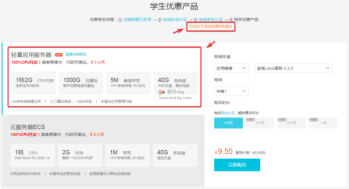 阿里云学生机目前有轻量应用服务器、云服务器ECS方案可以选择,配置都是1核2G内存、40G高效云盘,不同的地方是轻量应用服务器非分配5Mbps峰值带宽、月流量限制1TB,而云服务器ECS分配的是1Mbps独享带宽且不限流量。这个大家可以根据自己需要进行选择,如果是蜗牛的话更倾向于选择5Mbps带宽的轻量应用服务器,因为1TB流量已经足够一个站点使用了。另外阿里云学生机CPU使用基线都是100%哦,也就是可以长期跑满的。至于学生认证方面,阿里云也放宽了政策,12岁以上、24岁以下的身份完成实名认证后可以自动获得学生身份,并且在学生身份年限内可以享受以114元/年的价格续费。相信这样的学生认证大家很容易就搞到了吧。