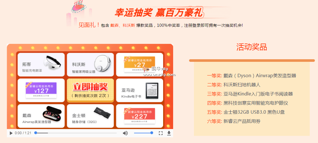 活动期间只需注册并完成实名认证即可获取一次抽奖机会、用户第一次购买任意活动产品也可获得一次抽奖机会,最多可获得五次抽奖机会,并且保证每次都100%中奖。抽中实物奖品的用户,活动期间将在12月2日进行第一次实物奖品发放、12月18日进行第二次实物奖品发放,抽到实物奖品的用户必须在奖品发放日前完成收货信息填写。下面是抽奖物品展示:- 一等奖:戴森(Dyson)Airwrap美发造型器