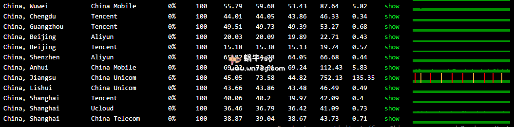 3、测试云服务器国内电信、联通、移动节点的上传、下载速度。蜗牛开通的配置带宽方面是5Mbps上线、300Mbps下行,再来看看下面测试结果,电信、联通、移动三网都基本都可以跑满。带宽方面表现堪称优秀。蜗牛开通的是联通线路,所有联通线路相对电信、移动线路要好一点。
