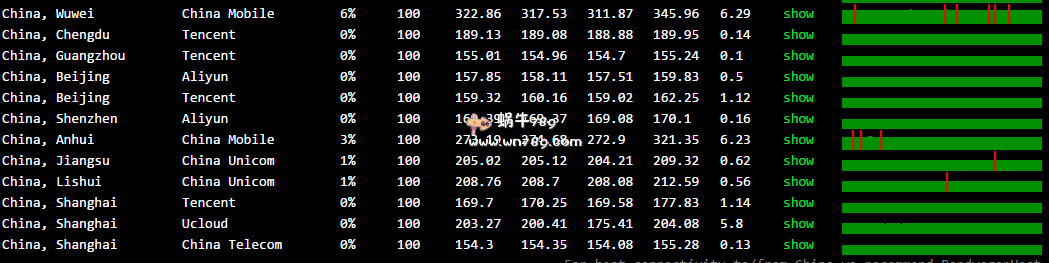 3、国内电信、联通、移动抖动及丢包测试。从测试结果来看带宽稳定性还是不错的,但部分节点有少量丢包,但是丢包率都比较低,影响不大。