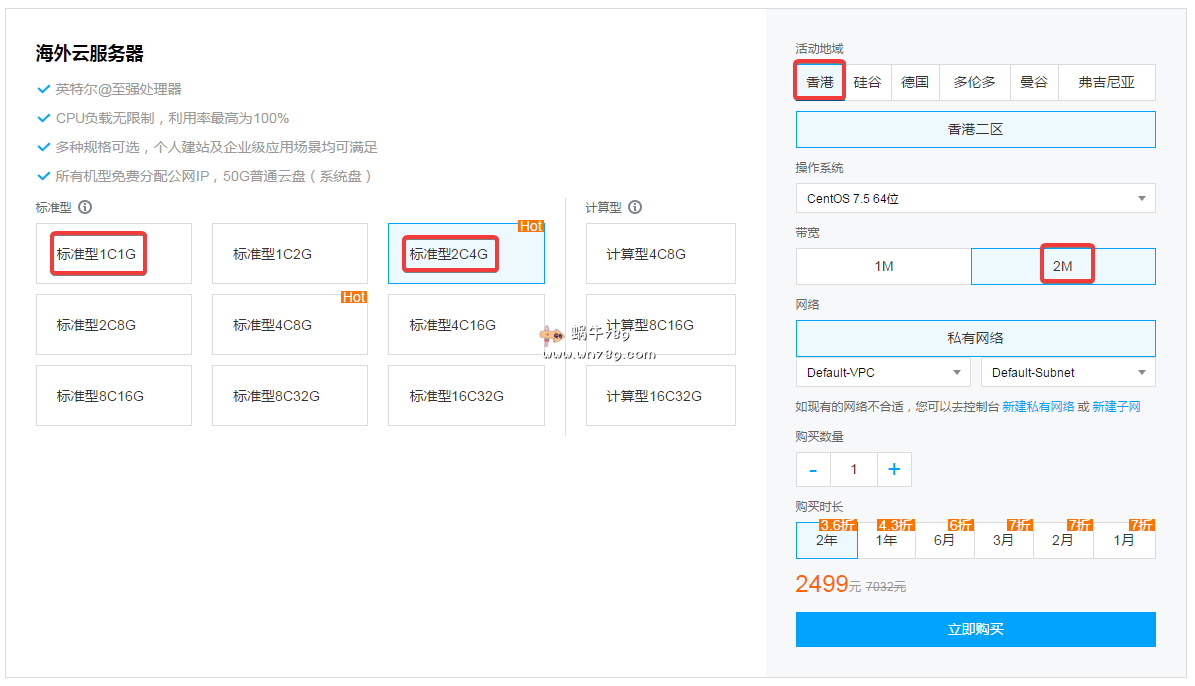 下面列举的方案是标准型促销方案,另外还有计算型的三款方案由于没有香港数据中心可以选择这里就没有列举出来了。建站推荐方案2核4G内存2Mbps带宽。购买前可以查看文章后面的评测。