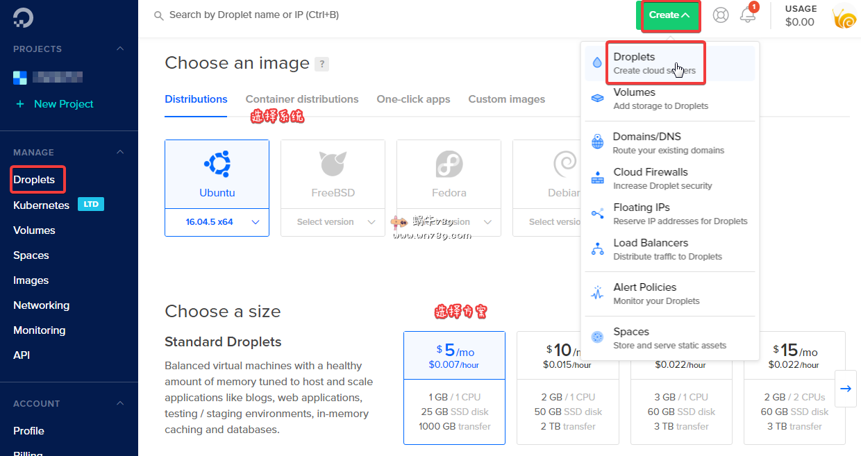 1、如下图进入到VPS创建页面。根据自己需要选择系统及配置,最低5美元/月起。