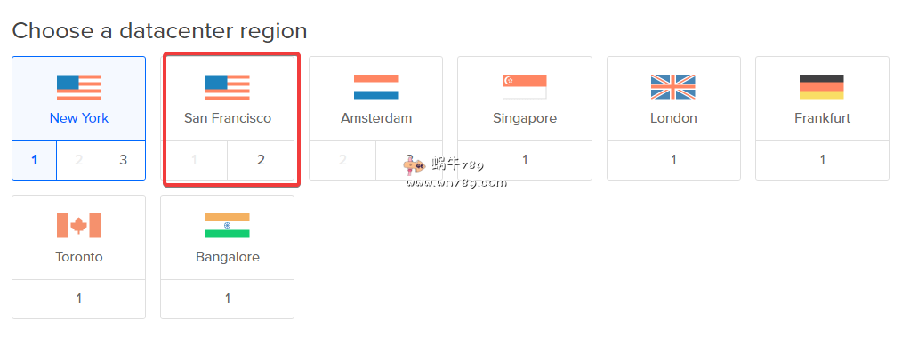 2、选择数据中心,国内用户建议选择旧金山,如下图红框机房。