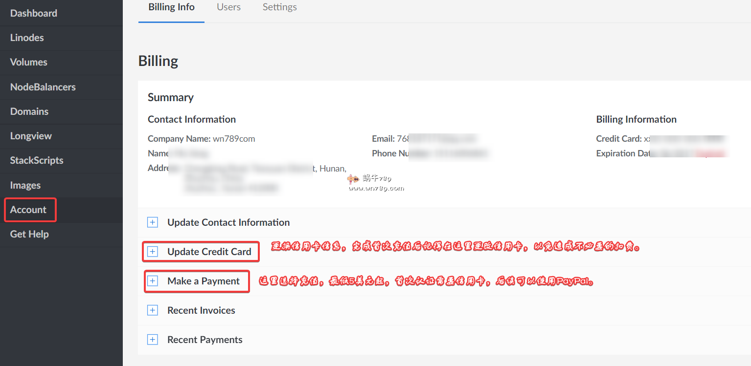 6、关于Linode新控制面板的充值及信用卡信息修改。下面的更换信用卡信息是非常重要的,完成首次充值后一定记得更改,以免造成扣费,至于怎么更改大家可以参照以前的老面板教程:Linode VPS新账号注册完成国内信用卡验证/奖励10-20美元优惠码。