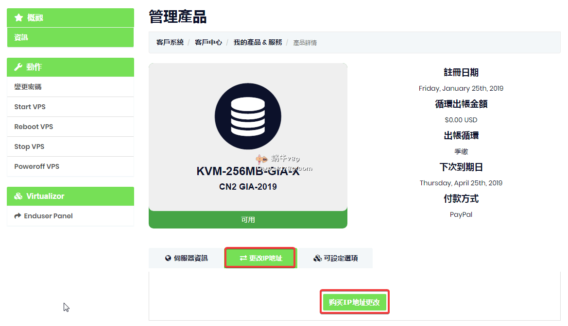 HostFlyte是一家成立于2018年的美国主机销售商,目前主要从事VPS、独立服务器、虚拟主机等产品销售,主打数据中心有洛杉矶、达拉斯、芝加哥、纽约水牛城等,根据架构的不同分为OpenVZ、KVM两种架构,另外洛杉矶数据中心还有CN2 GIA直连线路可以选择。最近商家VPS管理面板新增了一个更换IP的功能,每更换一次IP只收取2美元,此功能详情如下图,就不过多做介绍了。