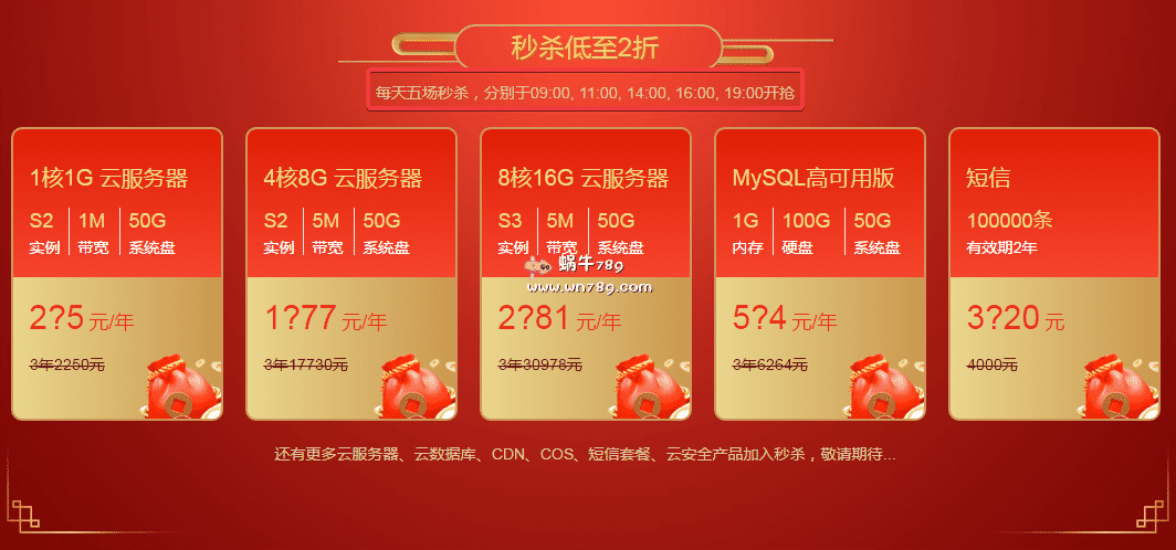 从3月5日开始每天9:00、11:00、14:00、16:00、19:00五场秒杀活动,主打云服务器、云数据库方案,这个还是比较有看头的。腾讯云促销活动一般新老用户均可参与活动,有云服务器、云数据库产品的大家可以重点关注。2折的秒杀力度相信大家都可以得到真正的优惠。
