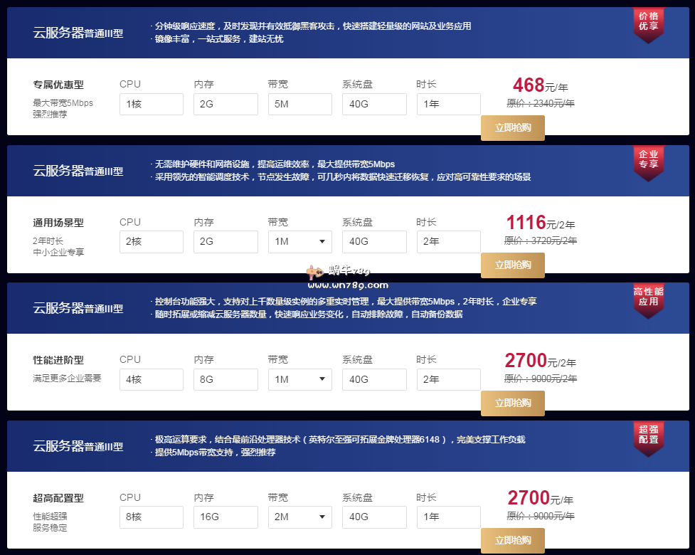 下面列举的是企业专区促销方案,相比秒杀方案,配置更高、分配的带宽更大,不过只限企业认证用户参与活动,这点有点不仅人意。