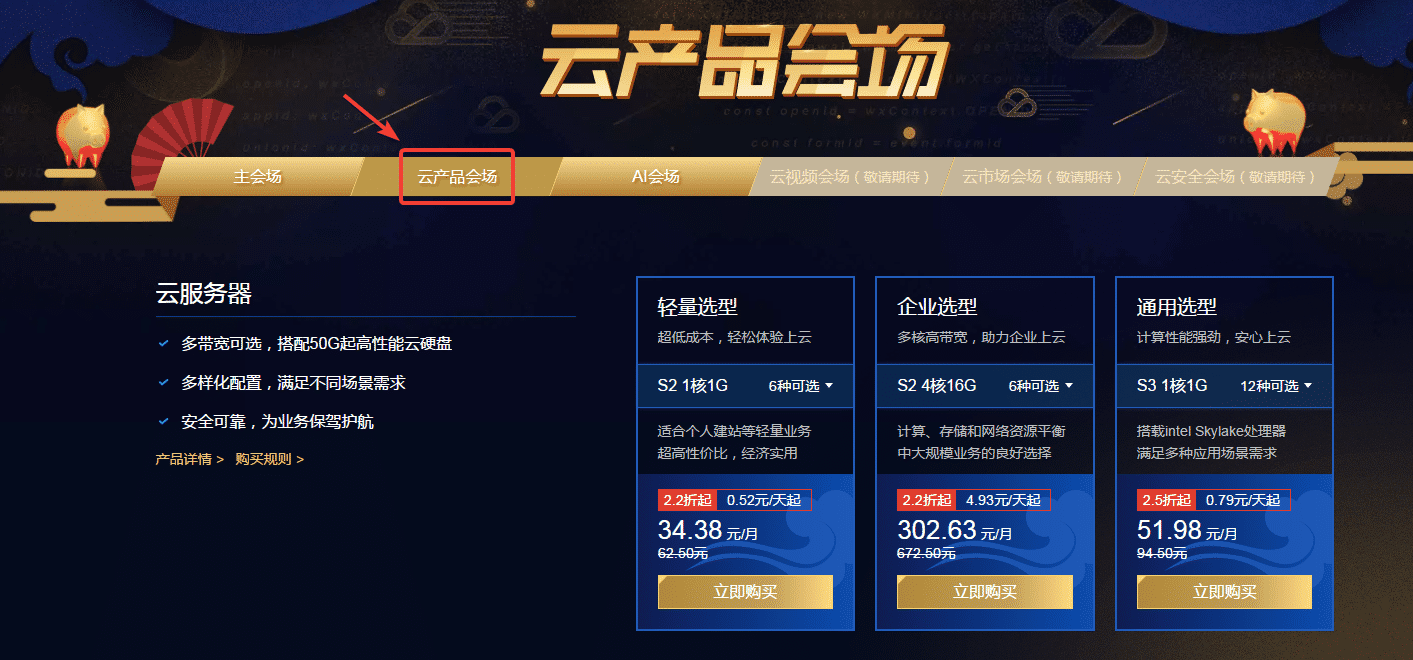 点击上面的地址可以直接进入到腾讯云2019年新春采购季活动,如果想购买云产品会场的云服务器产品就在导航栏点击“云产品会场”。