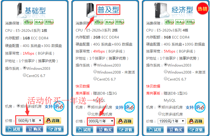 2、选择配置,推荐购买普及型或基础型,12月31日前购买一年送一年使用权。普及型999元两年,基础型560元两年。蜗牛问了客服,赠送时间购买主机自动赠送,不需要联系客服申请。
