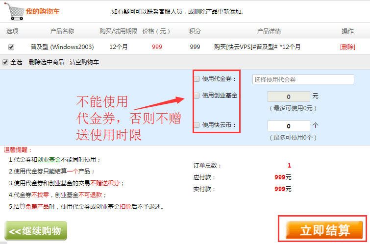 3、选择好自己需要的套餐后,点击购买进入到购物,这里不能使用代金券等优惠,只能实价购买才能获取赠送时间。