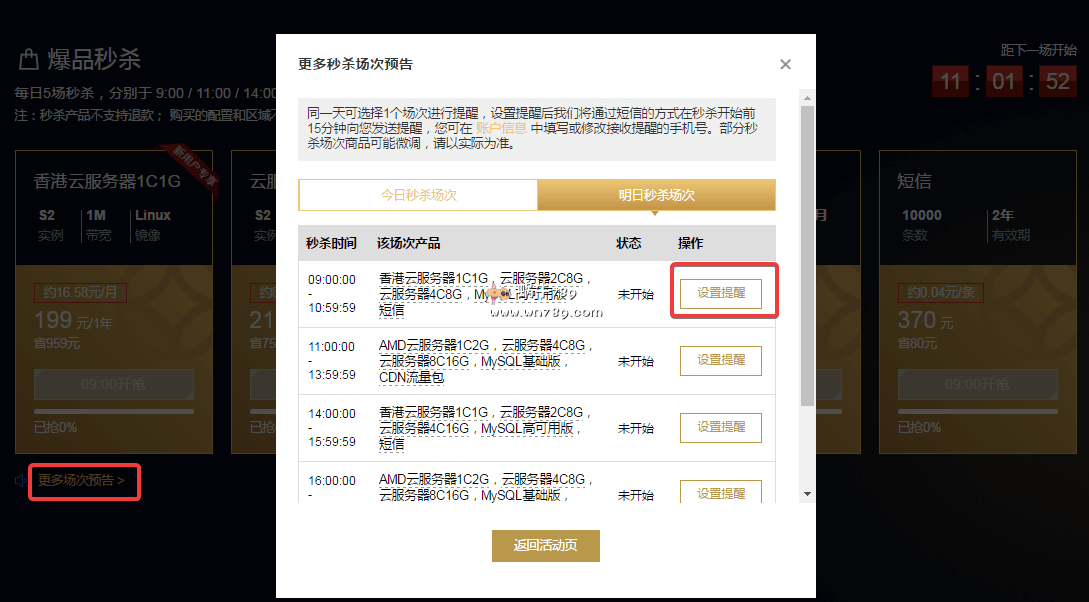09:00:00-10:59:59:香港云服务器1C1G1M(1年),云服务器2C8G5M(2年),云服务器4C8G5M(2年);
