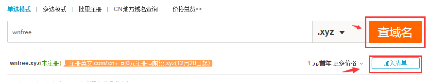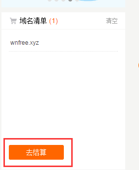 5、填写你要注册的域名,检查是否可以注册,如果可以,点击“加入清单”。然后点击右侧的“去结算”进入到注册信息填写页面。