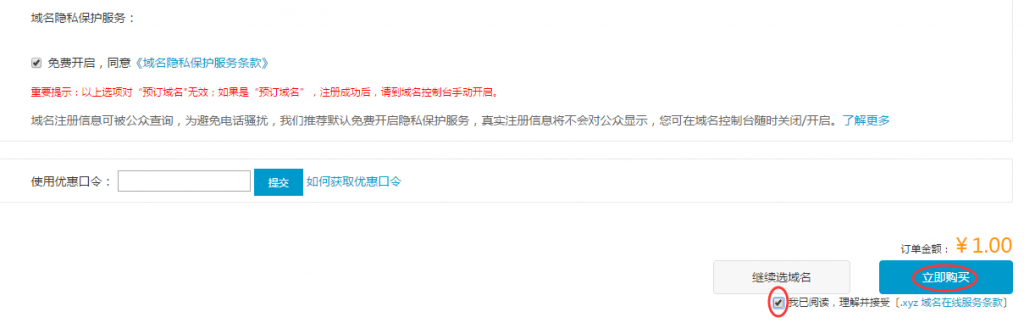 信息模板创建好后,回到域名注册页面并按F5刷新,然后选择个人注册信息,再点击“立即购买”进入到付款页面。